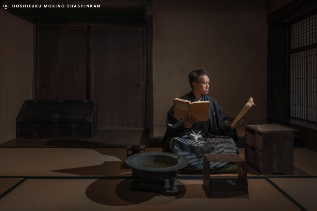 スタッフさんに許可を得て、展示品を撮影小物として写しながら、ライティングし光と影を活かした物語のあるアートなウェディングフォトを撮影しました。奥行きのある和室で撮影できるということで、色々な発想が浮かびました。